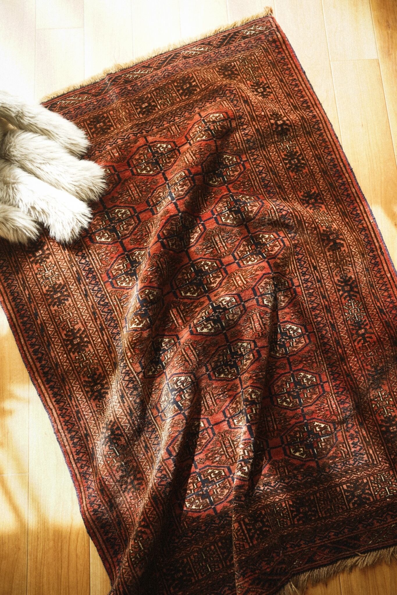 また染料によってパイルの落ち具合に差があり、パイルの高低差によってモチーフが浮き出て見えるような立体感が生まれているのがとても魅力的な一枚。