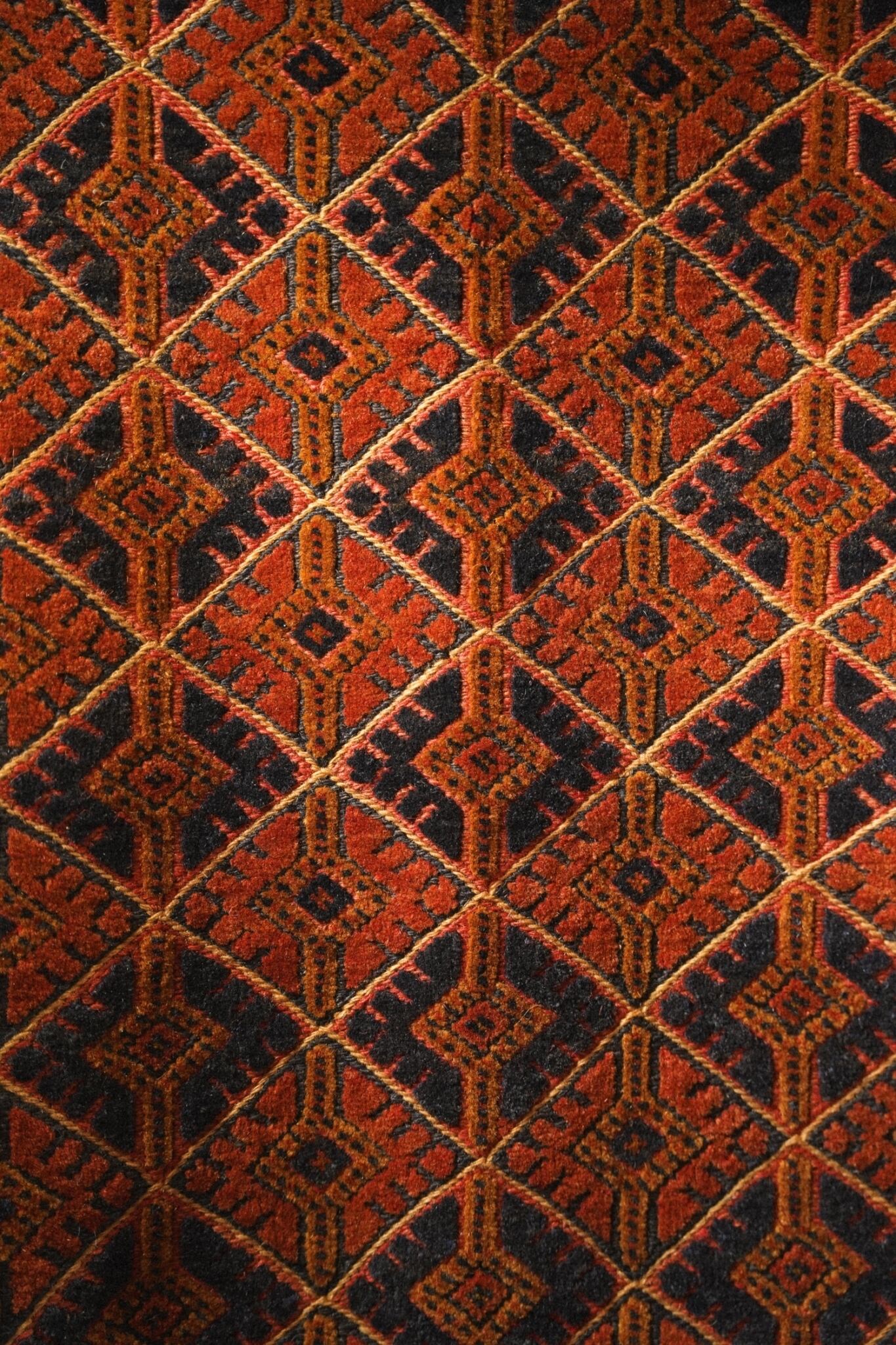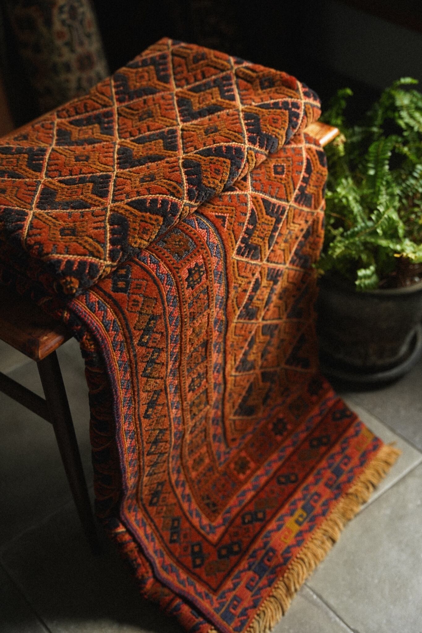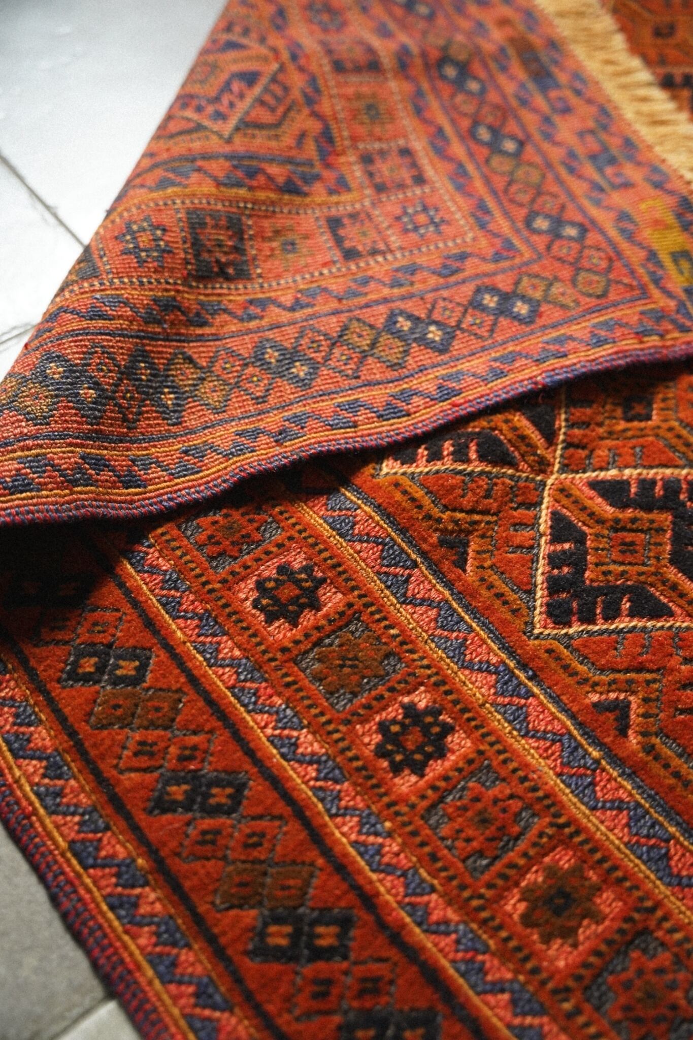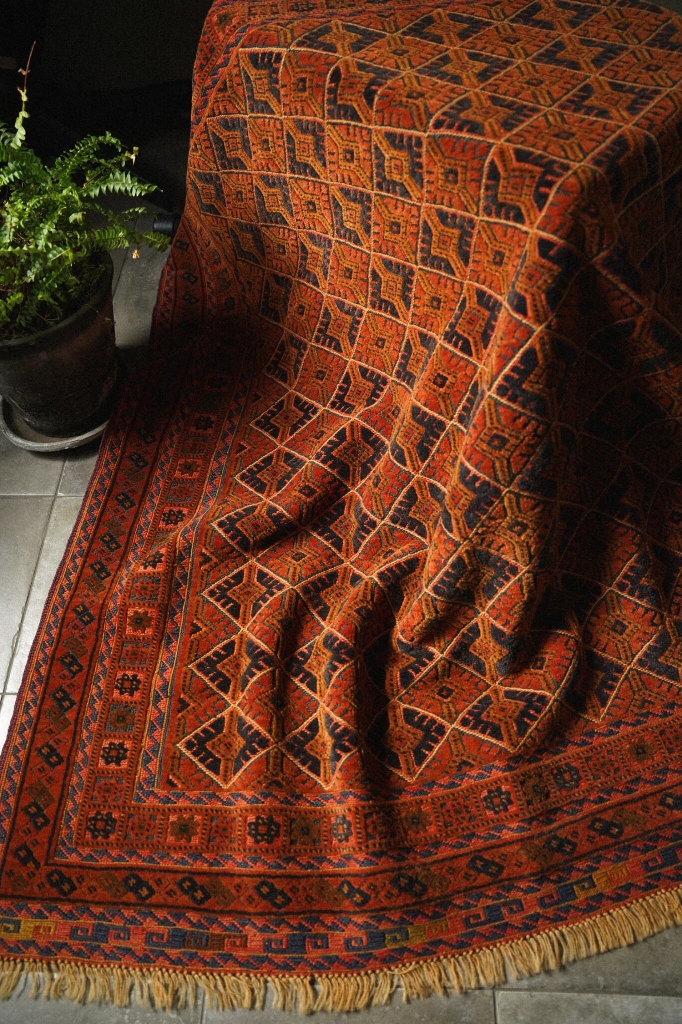 ネイビー、レッド、マスタード、ボルドーなど落ち着いたトーンの色味でまとまっており、インテリアにも取り入れやすくとてもお洒落な一枚。フィールド全体に菱形紋様が描かれ、ボーダー部分には八芒星が並ぶ可愛らしいデザイン。