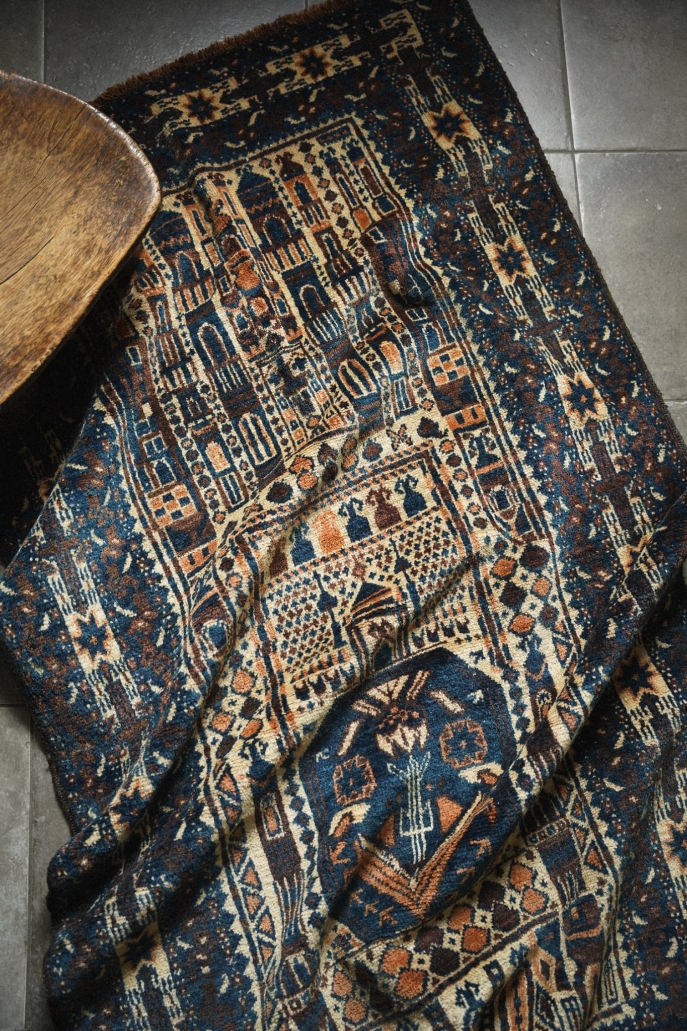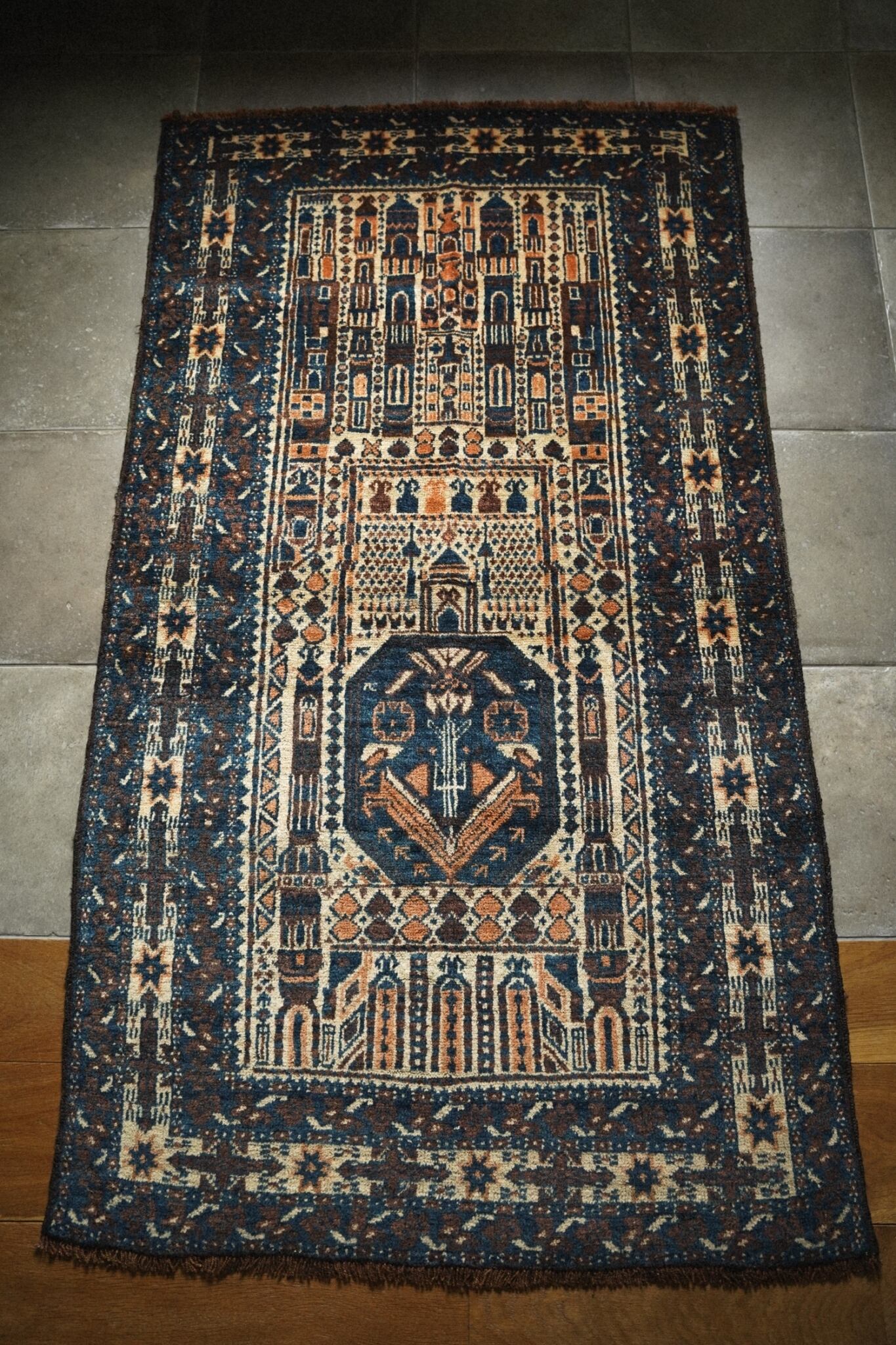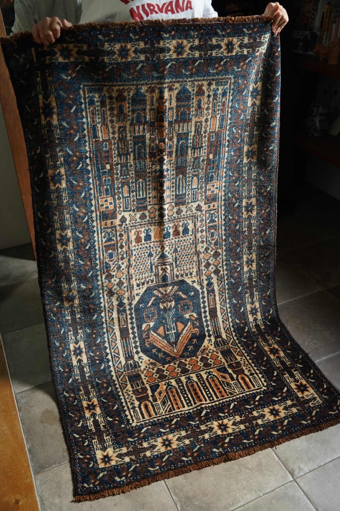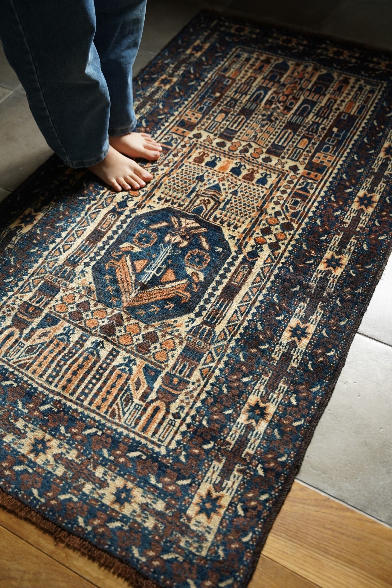 ブルーを基調にブラウン、ボルドー、オレンジ、ベージュの渋めの配色が素敵な一枚。フィールドにはミフラーブと呼ばれるイスラム建築由来のモチーフが細かに描かれています。2本の柱の真ん中には力強く華やかな吊りランプ。ボーダー部分には八芒星やボテの連続紋様が織り込まれた凝ったデザイン。パイルは綺麗に残っておりグッドコンディション。柔らかくしっとり滑らかな手触りが気持ち良いです。リビングやデスク下、ベッドサイド、サイドボードの前などぴったりのサイズ感です。ブルー系のラグや細かいモチーフのラグをお探しの方におすすめです。ぜひお気に入りの場所にどうぞ!