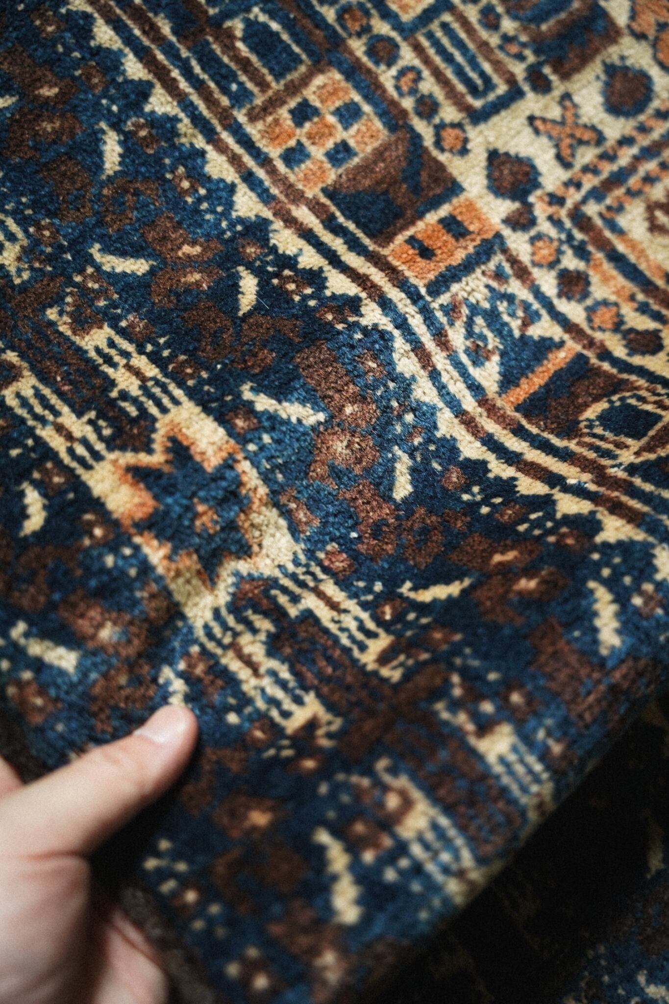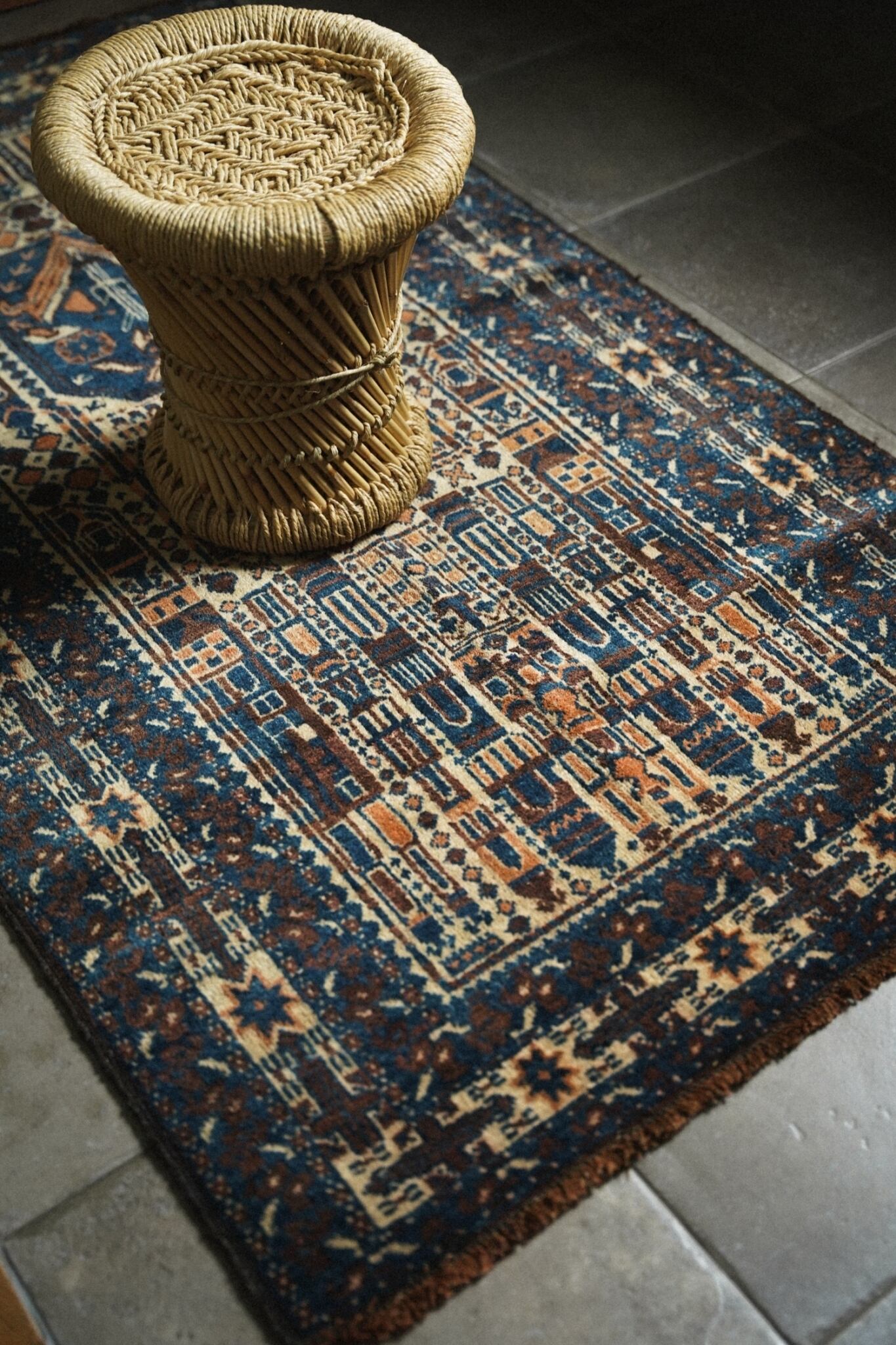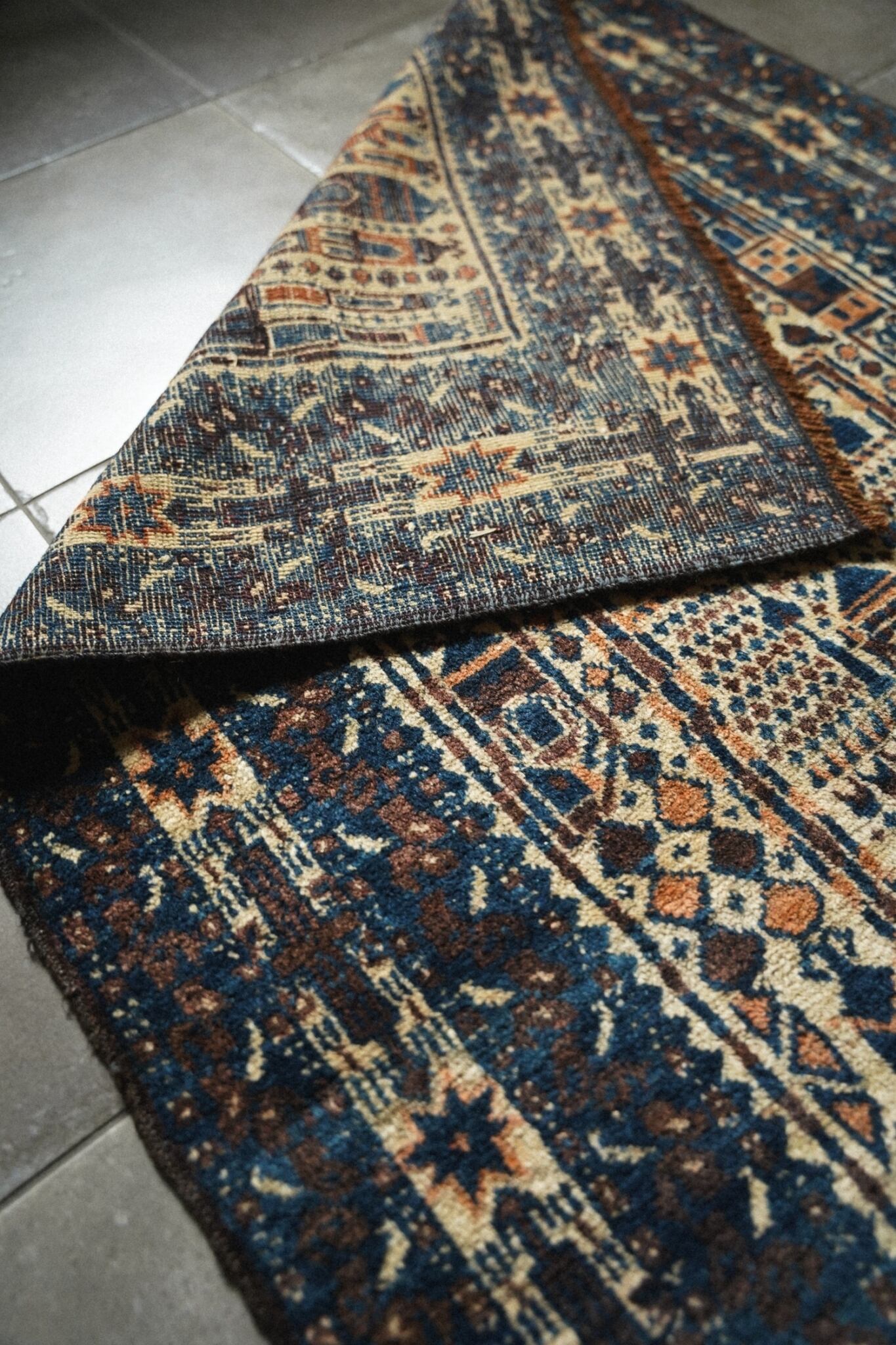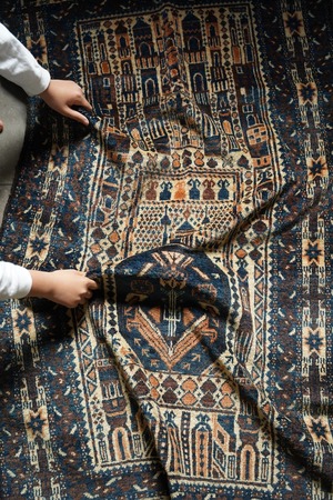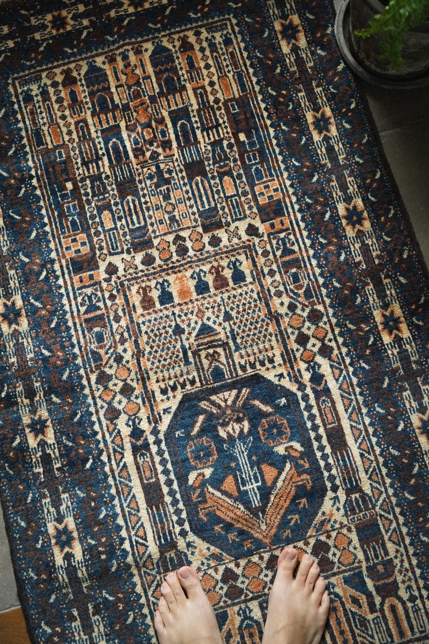 ブルーを基調にブラウン、ボルドー、オレンジ、ベージュの渋めの配色が素敵な一枚。フィールドにはミフラーブと呼ばれるイスラム建築由来のモチーフが細かに描かれています。2本の柱の真ん中には力強く華やかな吊りランプ。ボーダー部分には八芒星やボテの連続紋様が織り込まれた凝ったデザイン。パイルは綺麗に残っておりグッドコンディション。柔らかくしっとり滑らかな手触りが気持ち良いです。リビングやデスク下、ベッドサイド、サイドボードの前などぴったりのサイズ感です。ブルー系のラグや細かいモチーフのラグをお探しの方におすすめです。ぜひお気に入りの場所にどうぞ!