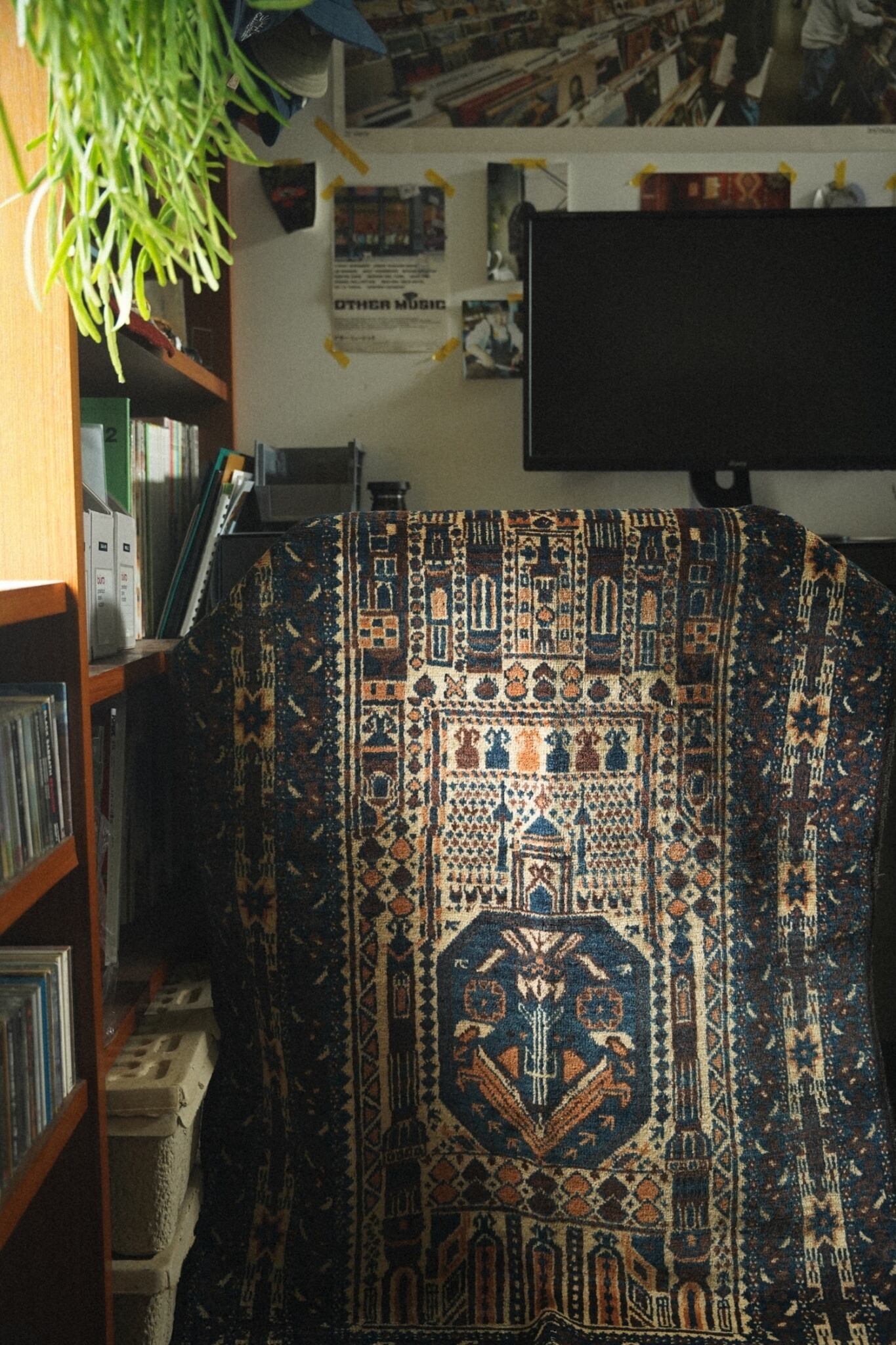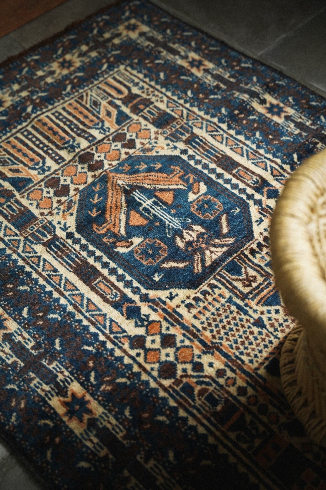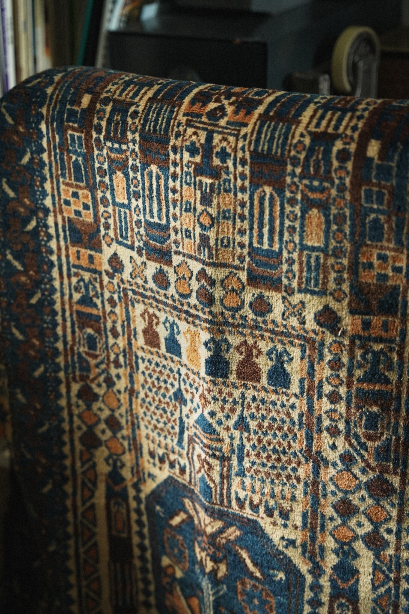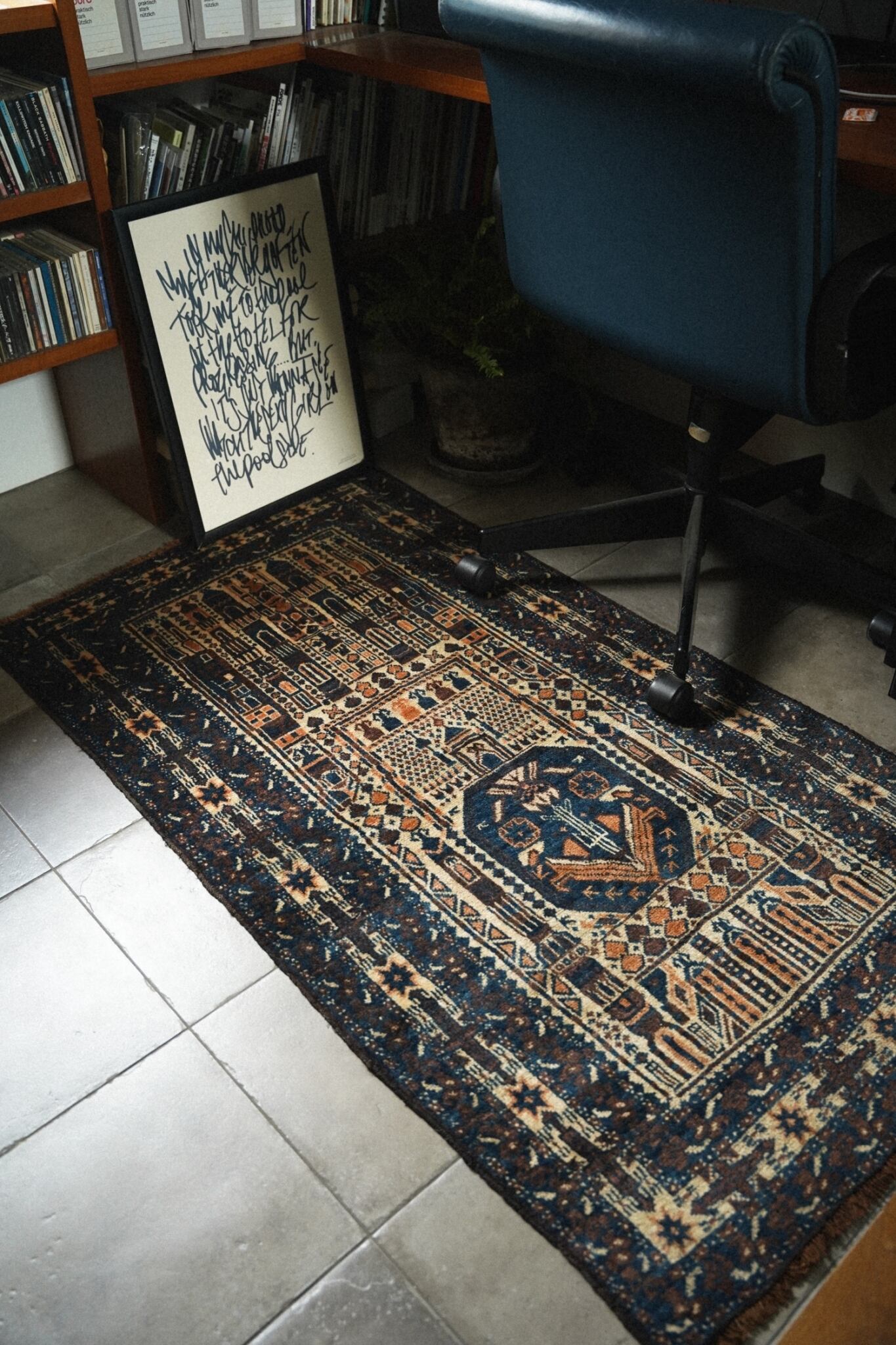 ブルーを基調にブラウン、ボルドー、オレンジ、ベージュの渋めの配色が素敵な一枚。フィールドにはミフラーブと呼ばれるイスラム建築由来のモチーフが細かに描かれています。2本の柱の真ん中には力強く華やかな吊りランプ。ボーダー部分には八芒星やボテの連続紋様が織り込まれた凝ったデザイン。パイルは綺麗に残っておりグッドコンディション。柔らかくしっとり滑らかな手触りが気持ち良いです。リビングやデスク下、ベッドサイド、サイドボードの前などぴったりのサイズ感です。ブルー系のラグや細かいモチーフのラグをお探しの方におすすめです。ぜひお気に入りの場所にどうぞ!